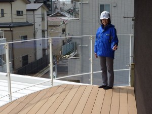 弊社で設計施工したのは、2階の屋根の上に見えるフェンスと一体となったバルコニーデッキです。