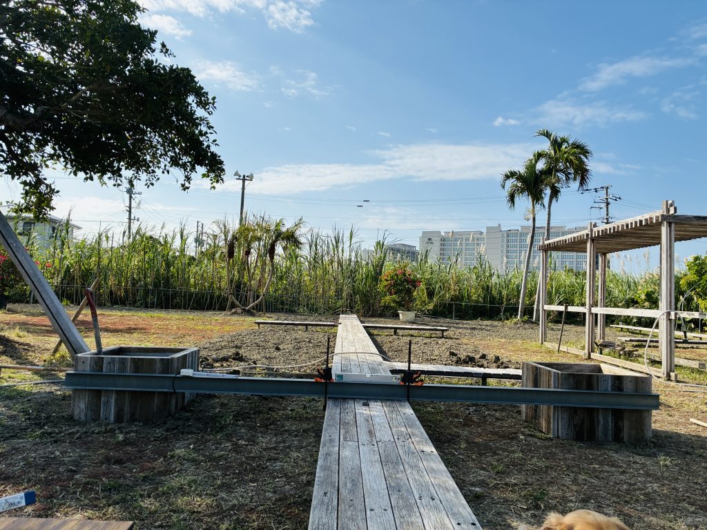 沖縄本社へもそこそこの量の古材を運搬し、借りた畑に「南国庭園」をつくることにしました。東京事務所で都会的な印象の再利用法にトライしたので、ここ沖縄ではワイルドに計画しようと。また、お借りした畑に設置するため、もし、お返しすることがあるとしても容易に復旧できるよう、基礎は螺杭(螺旋付の鋼製杭)を採用する方針としました。