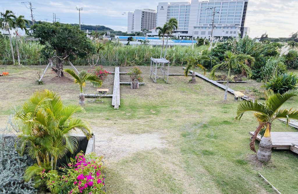 デッキやパーゴラ、プランターなど、ここと同じデザインのものが首都圏にあったとしたら、古めかしいものに映ると思いますが、南国植物と組み合わせると、あたかも昔からそこにあったような「ごく自然」な雰囲気になるのが不思議です。同じ寸法の再生木材でつくったとしても、このように「馴染む」ことはないでしょう。