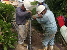 100V対応の専用工具で施工 下孔穿孔→螺杭打設(約5分程度) 100V発電機 |